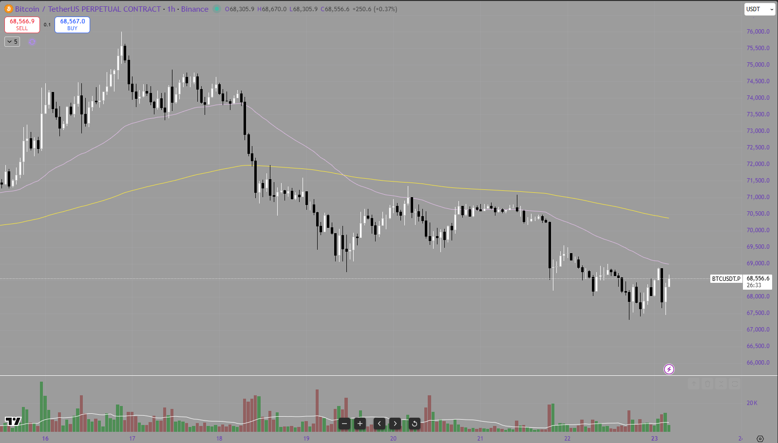 The strongest part of the hourly chart this week was the middle section of the move, where BTC pushed into the low-$70,000 region. That breakout leg came with enough momentum to suggest the market was not simply short covering for a few candles, but rather beginning to rotate into a more constructive short-term phase. However, once price reached that upper zone, follow-through slowed. Profit-taking emerged, and the market began to roll over slightly from the highs.