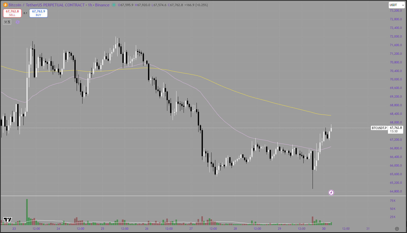 What made the hourly chart especially interesting was the late-week flush lower followed by a recovery. Price dropped sharply into the high-$60,000 region, briefly trading with a much more aggressive bearish tone before buyers stepped in. That rebound matters because it shows there is still meaningful dip demand underneath the market. The bounce was not random either. It came after a fairly emotional downside extension, which often signals that weaker hands were being shaken out and short-term liquidity was being cleared before price stabilised.
