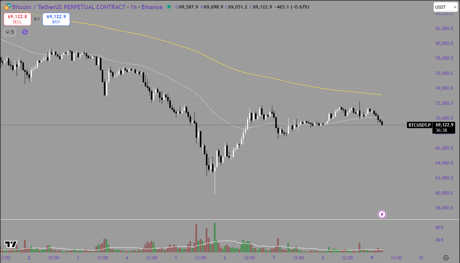 On the hourly chart, Bitcoin spent most of the week in a bearish structure, printing a sequence of lower highs and lower lows. Early attempts to reclaim short-term resistance were consistently rejected near the 1H moving average, reinforcing it as dynamic resistance rather than support.